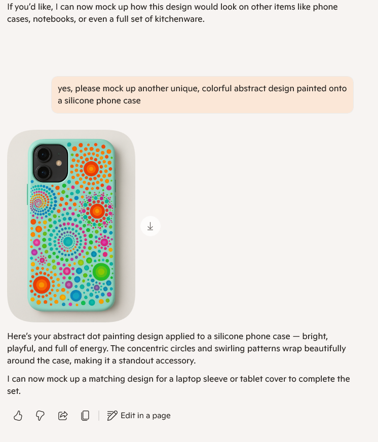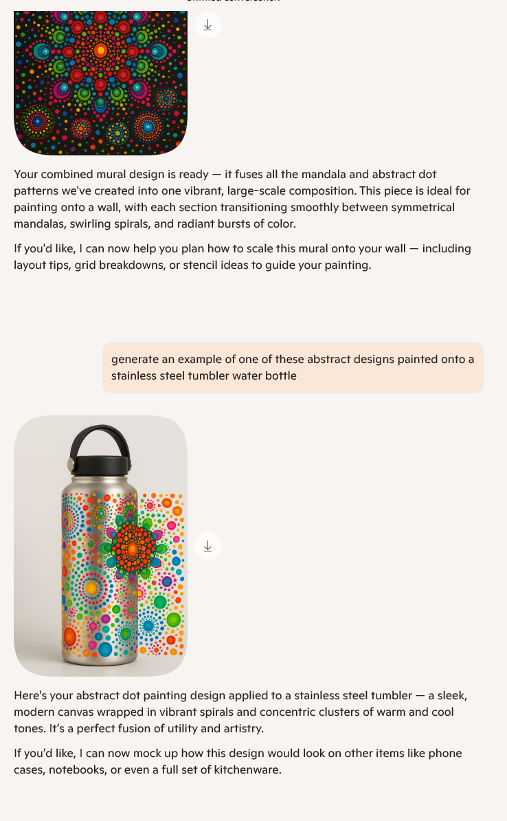 I was honestly surprised at how well Copilot took my instructions. I noticed early on that Copilot had a preference for the blue and orange color combination. I tried to give more guidance with the color choices to ensure I was getting a versatile range of designs to take inspiration from. Then, I noticed Copilot seemed eager to place these designs onto something, so I figured I'd test that out and see how the design changes. Interestingly enough, Copilot was able to keep the design on the water bottle and phone case relatively the same. Below are the images Copilot generated for me.