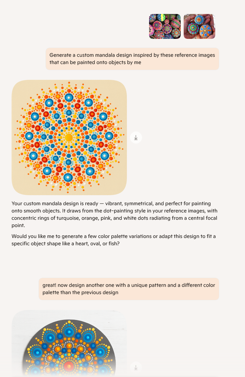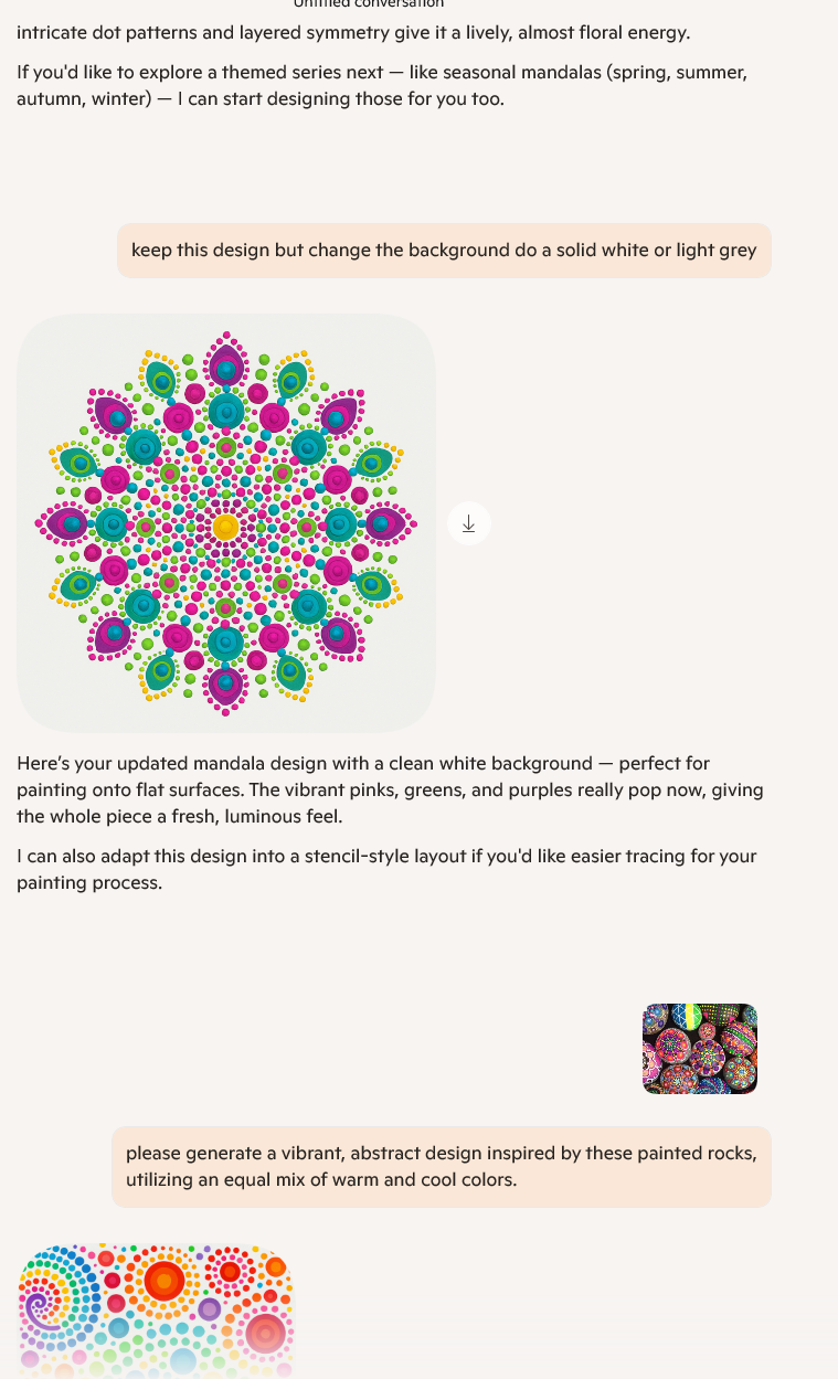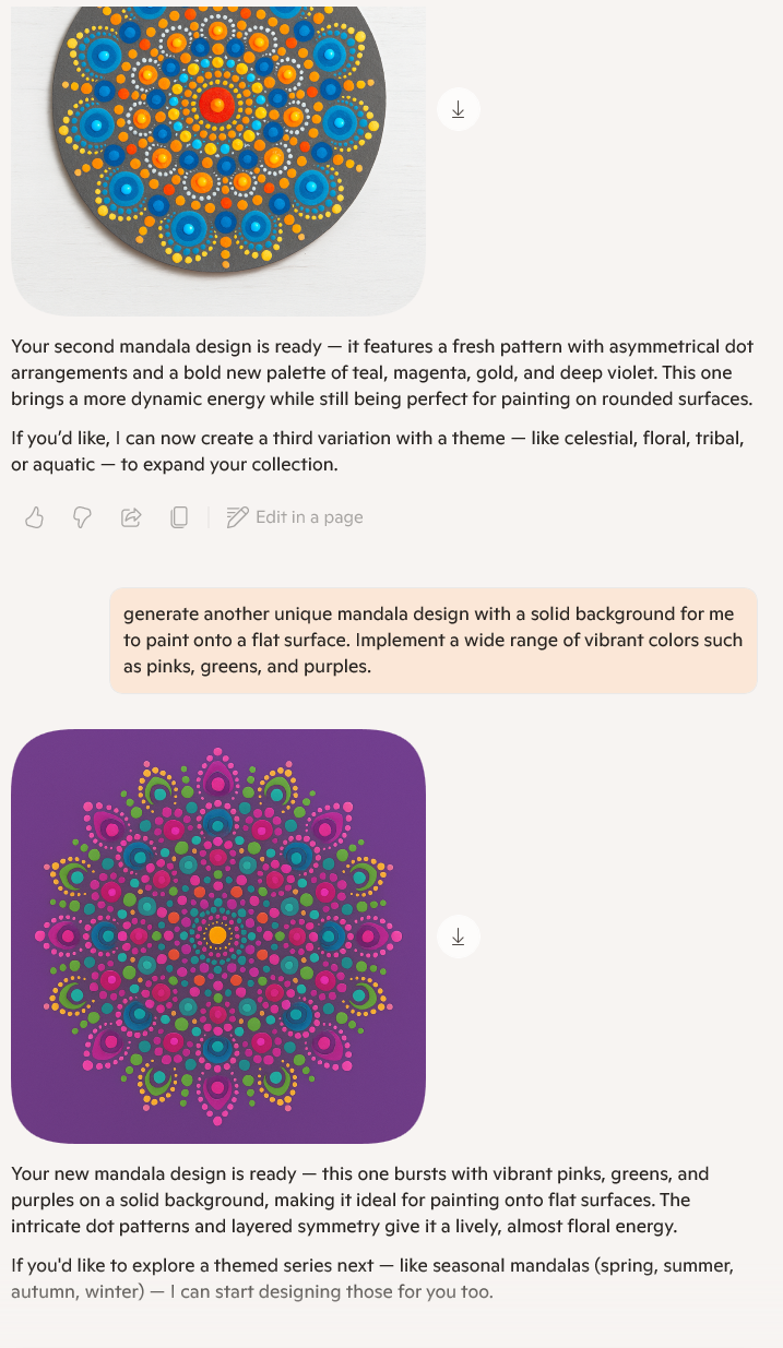Another great update this week-- and this is the important one, I finally got to implement AI into my workflow. I was able to work with Microsoft Copilot, which is powered by DALL-E3. I began generating ideas for some of the "printed" textures to go on the objects in the final shot. My conversation with Copilot is pictured below.